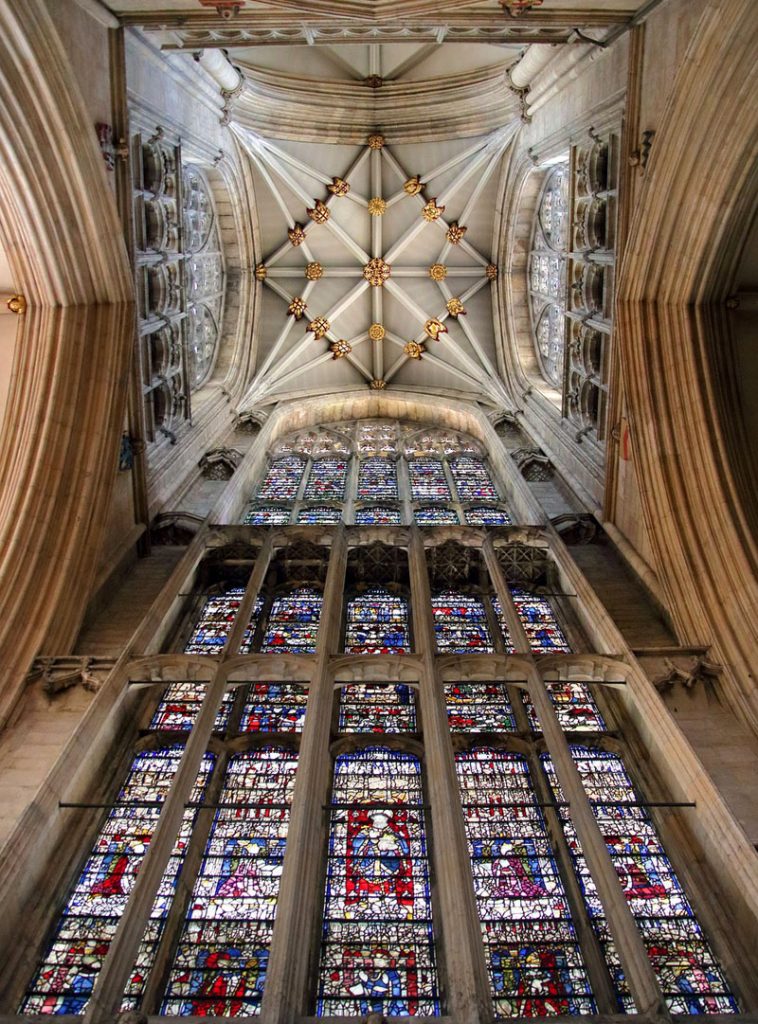 York Minster has some of the best medieval glass in Europe and the earliest panels date from 1170. Paul showed us some panels in great detail – which can only be seen from close up – not as the visitor sees from floor level as, for instance, the Five Sisters window is 53 ft high, – the largest expanse of grey or griselle glass in the world. The design for this window (in 1260) may have been influenced by Islamic Art following cultural exchange during the Crusades. By 1310 coloured panels had been re-introduced interspersed with the “grey” Islamic type patterns.